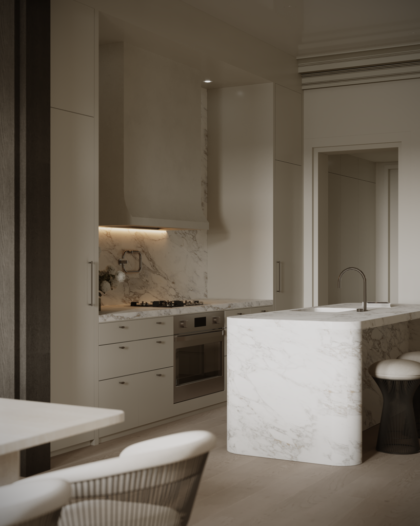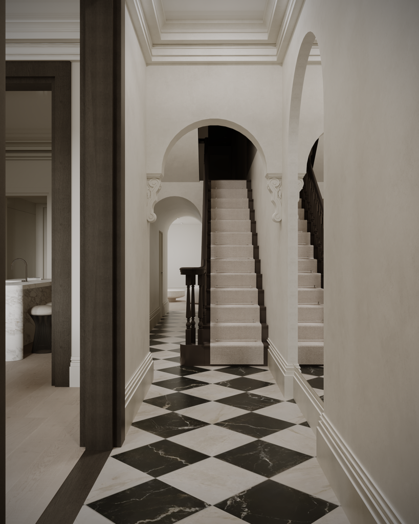 Our approach was one of careful heritage restoration: reinstating a sense of calm formality, layered with refined materiality and timeless detailing. The result is a classic, considered interior – quietly elegant, historically grounded, and fitting of a residence that holds an important place within Melbourne’s architectural and social history.