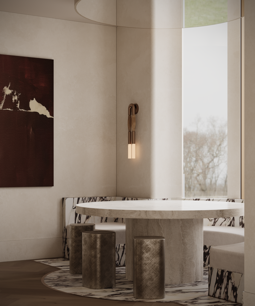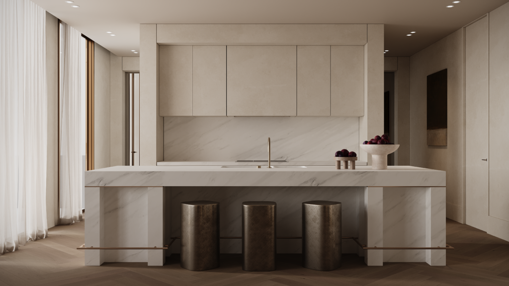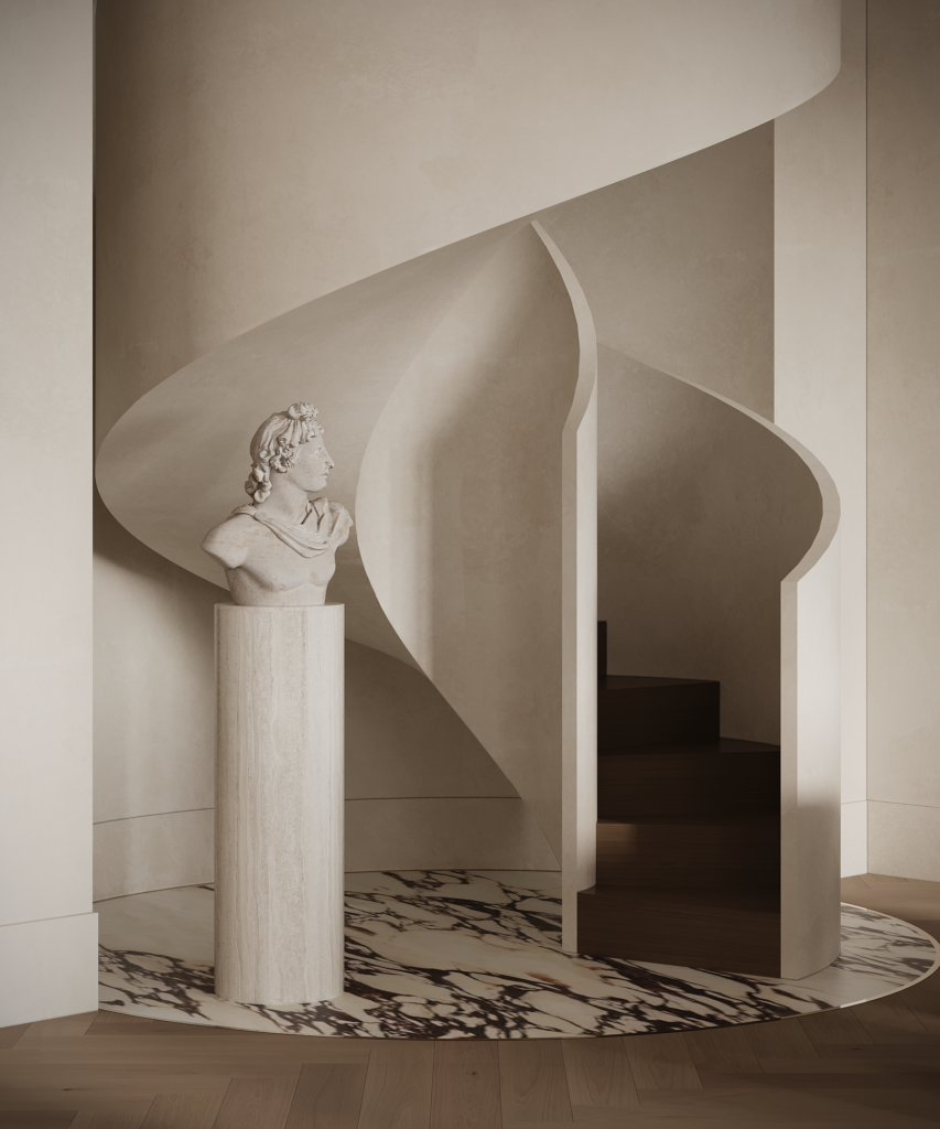 The open-plan living space is defined by architectural order and sculptural mass. A spiral stair introduces classical reference, while the kitchen and dining zone is conceived as built form – marble integrated with symmetry and restraint, creating a sense of quiet, enduring opulence.